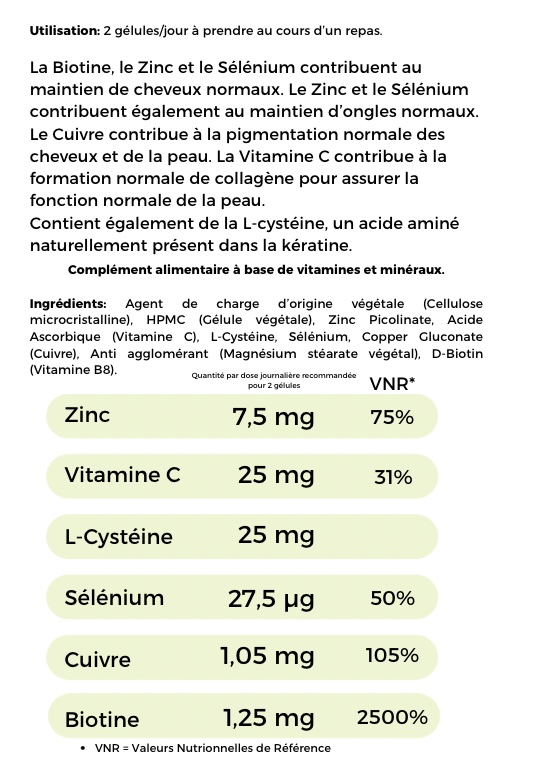- Biotine hautement dosée : favorise la pousse et la fortification