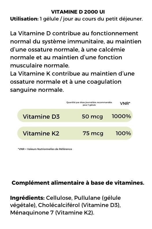 💊 Posologie : 1 gélule / jour = 2000 UI de D3 + 100 µg de K2